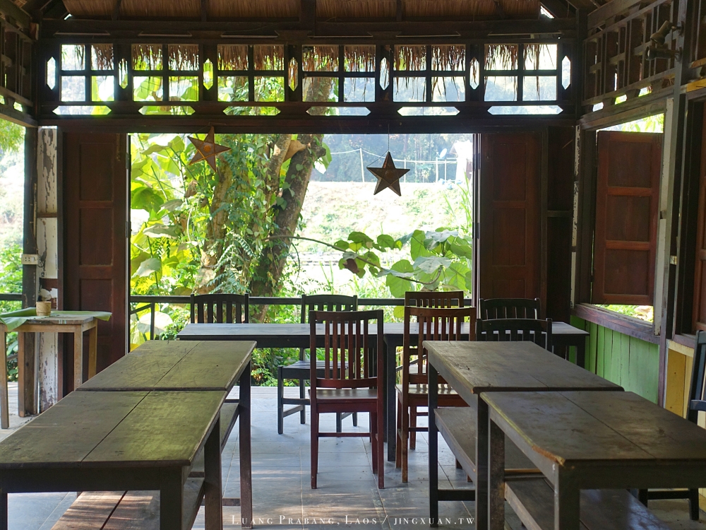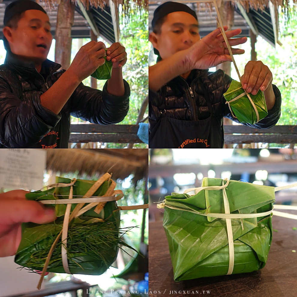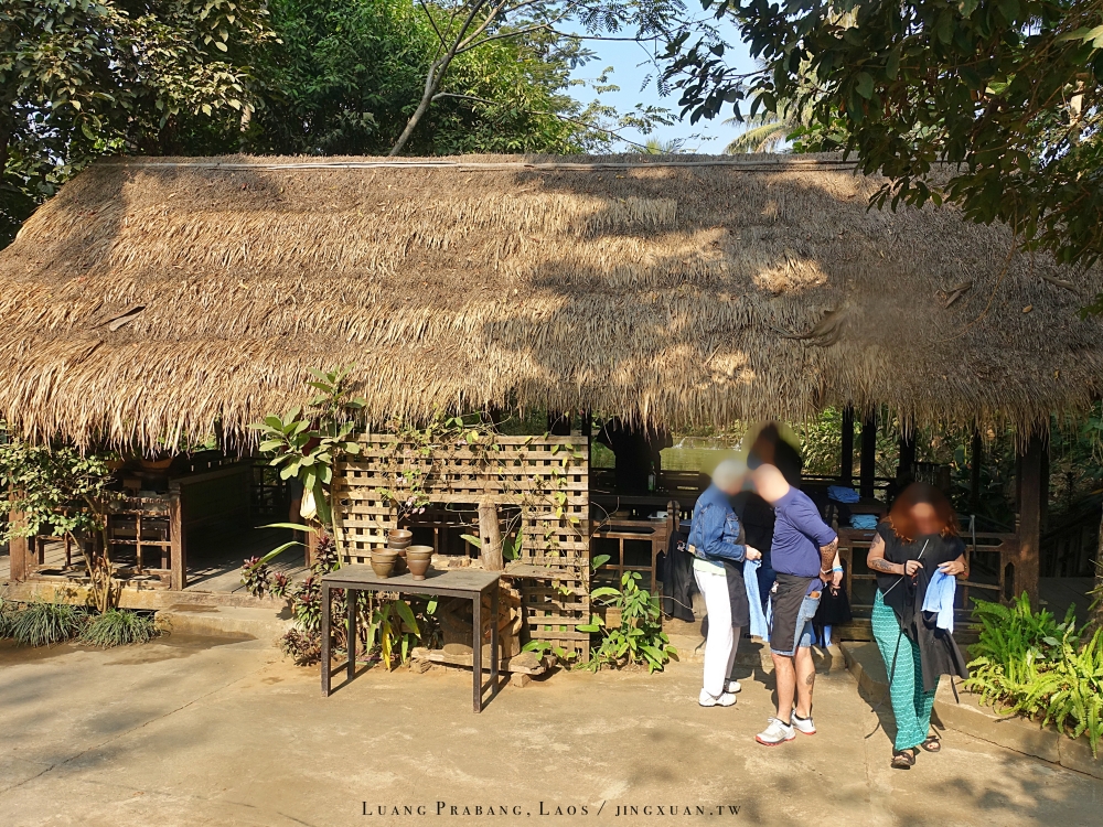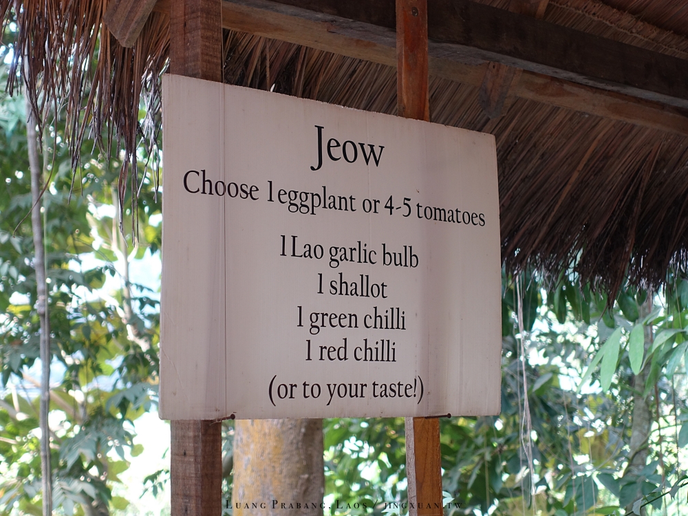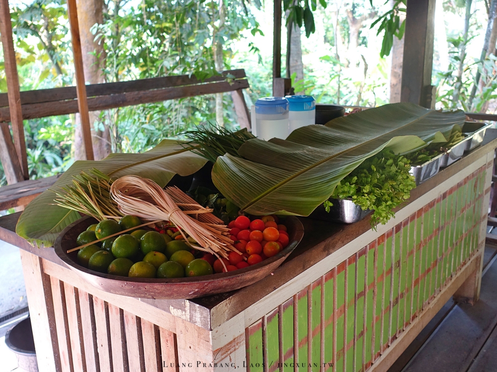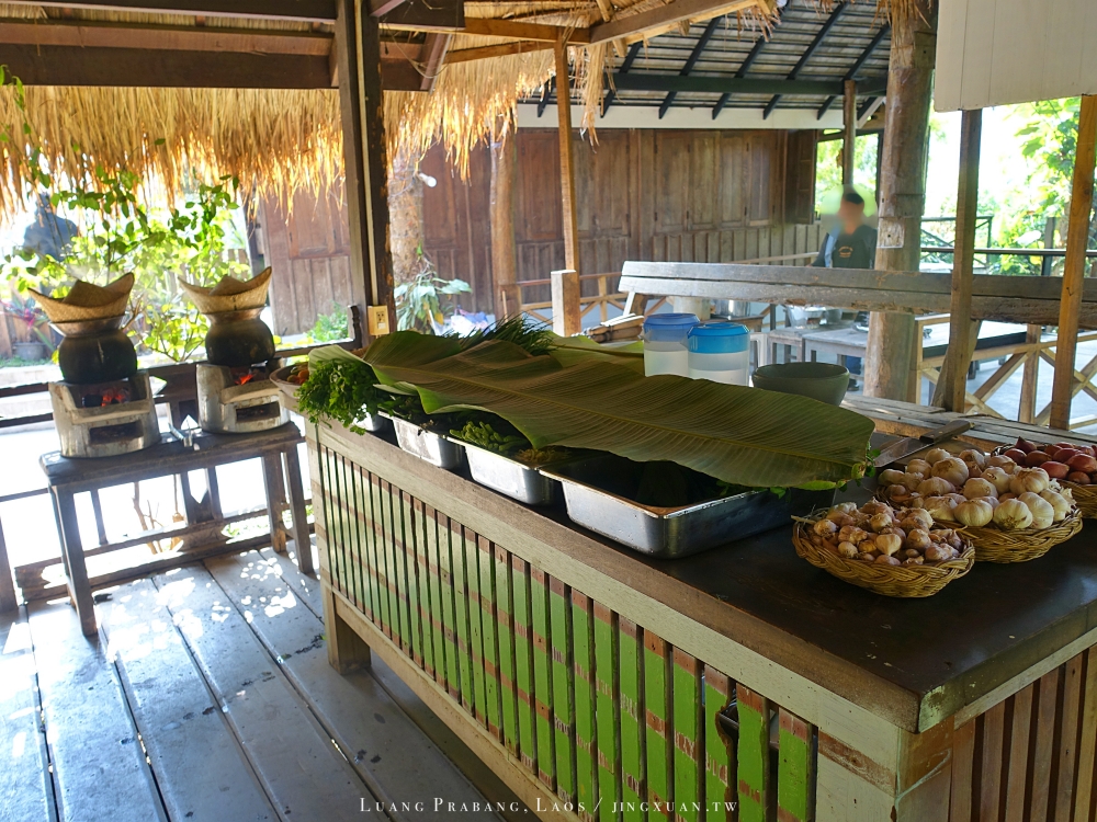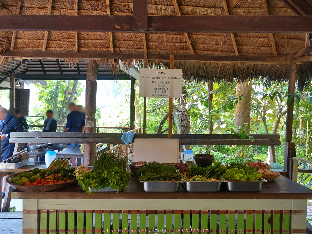 結束市場導覽後,老師繼續駕著嘟嘟車載我們前往約30分鐘車程外的戶外廚房。今天,我們隱身在被田園、池塘與小河環繞的茅屋中,學習製作並品嚐道地的寮國料理。與暹粒與河內的料理課程相似,開始前同樣先穿上圍裙、清潔雙手,不同的是,龍坡邦上課環境更貼近自然。雖然費用相對較高(38USD/人),但包含市場導覽、食材認識、料理體驗與文化學習,整體內容豐富且物超所值,含金量滿滿的一天!