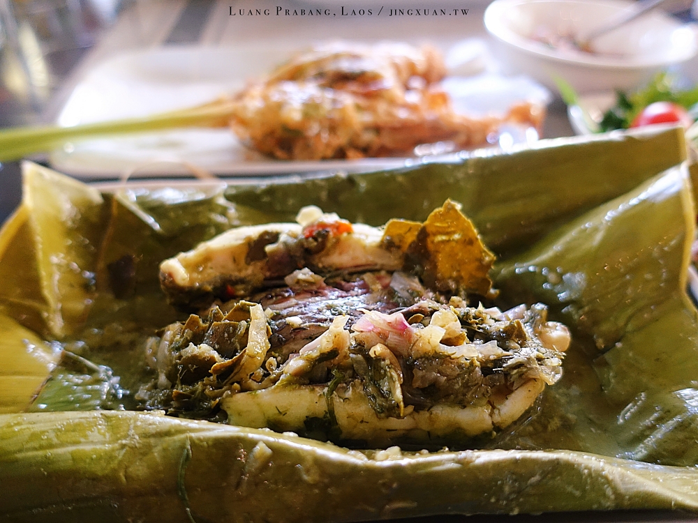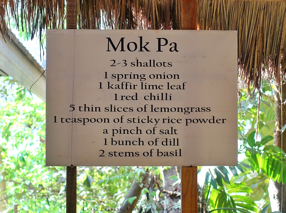 Mok Pa/Fish Steamed in Banana Leaves 香蕉葉蒸魚,製作這道菜時,讓人聯想到暹粒料理教室的高棉國菜「阿莫克魚」。不同之處在於,寮國香蕉葉蒸魚需先將調味料/醬用杵臼 Mortar and Pestle 搗/椿成糊狀,與魚塊混合後,再將剩餘的調味汁與魚片一同包入事先稍微烤軟的香蕉葉中,最後蒸熟。寮國料理運用杵臼「椿/搗」的手法,使食材更加入味,而且使用比例比暹粒與河內的料理課程還高。