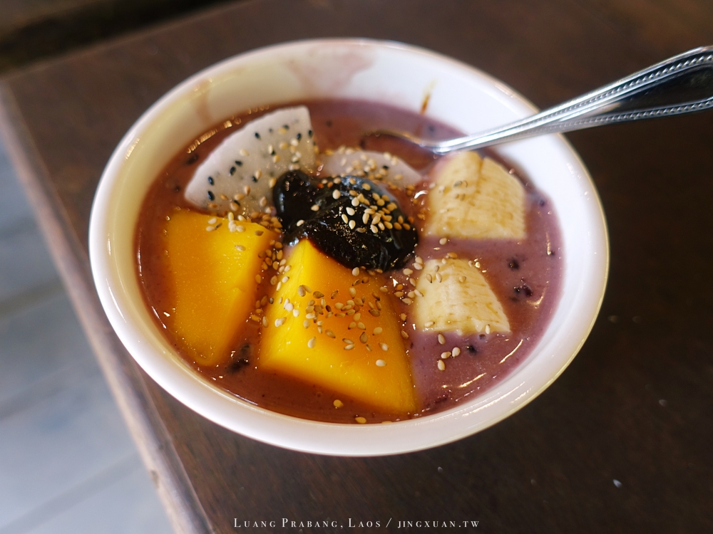 Khao Gam/Purple Sticky Rice with Coconut Sauce 椰香紫糯米飯,寮國紫糯米相當美味,平日對於糯米甜品不熱衷的我們,竟也吃得津津有味,當然熱帶國家水果的芒果、香蕉及火龍果也有加分。